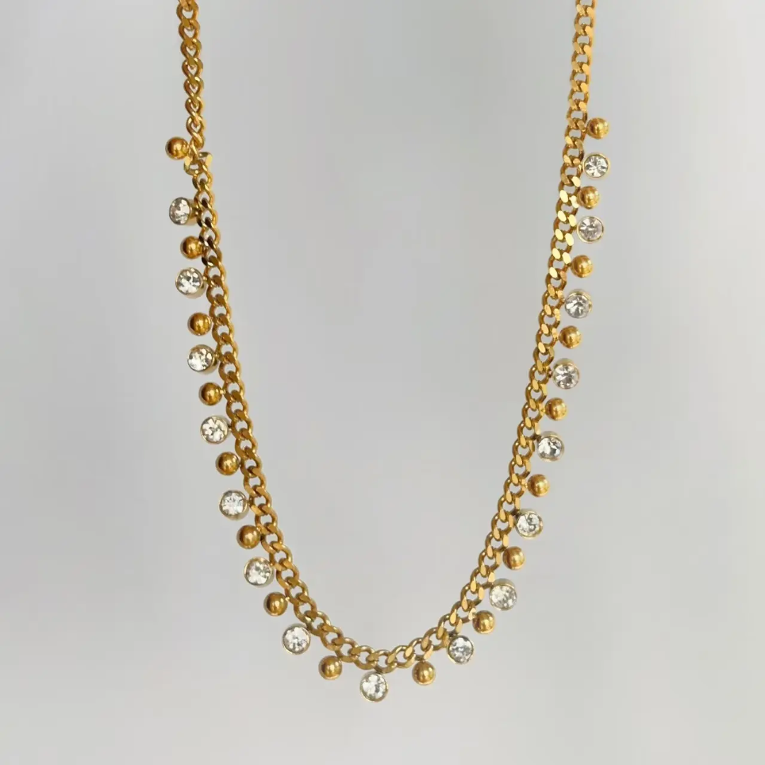 Premium white diamond tassel necklace — crafted from high-quality stainless steel with luxurious 18k gold plating. Designed to be anti-tarnish, waterproof, and hypoallergenic, making it perfect for comfortable, long-lasting wear.
